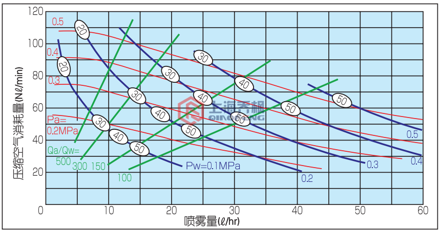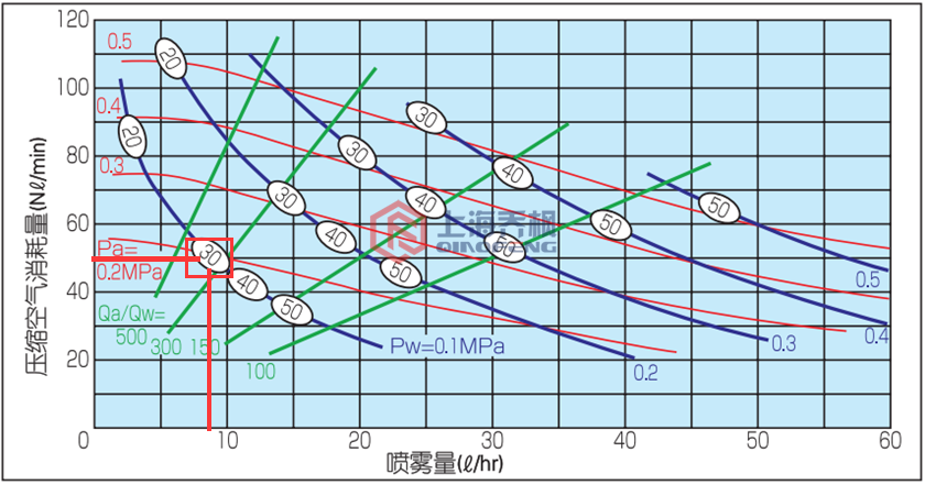 如需其他尺寸粒徑的霧滴,先確定處理量,做一條豎向軸,找到大致粒徑大小,然后找到交點,找出壓縮空氣壓力。